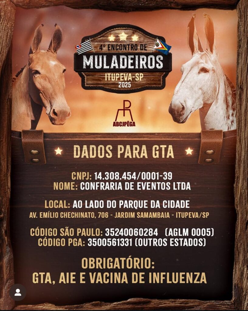 Atenção para as informações referente a entrada dos animais que participarão da 2ª Etapa do Circuito Nacional de Marcha de Muares e 1ª Etapa da Copa do Brasil de Asininos 2025/2026, que acontecerá durante o 4º Encontro de Muladeiros de Itupeva/SP nos dias 19 a 23 de novembro.