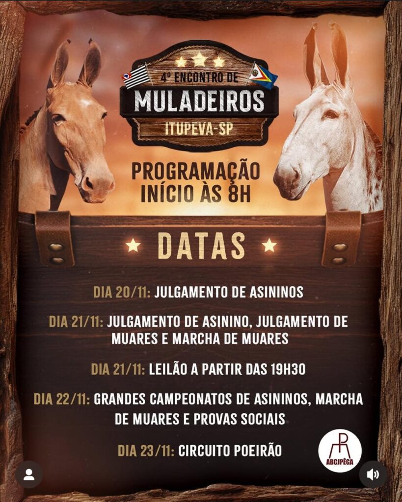 Inscrições abertas para a 2ª Etapa do Circuito Nacional de Marcha de Muares e 1ª Etapa da Copa do Brasil de Asininos 2025/2026, que acontecerá durante o 4º Encontro de Muladeiros de Itupeva/SP nos dias 19 a 23 de novembro.