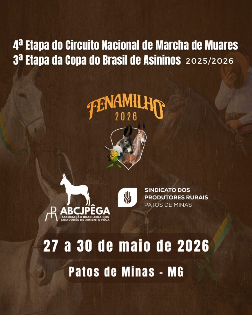Vem aí a 4ª Etapa do Circuito Nacional de Marcha de Muares e 3ª Etapa da Copa do Brasil de Asininos 2025/2026 que acontecerá durante a Fenamilho 2026.
