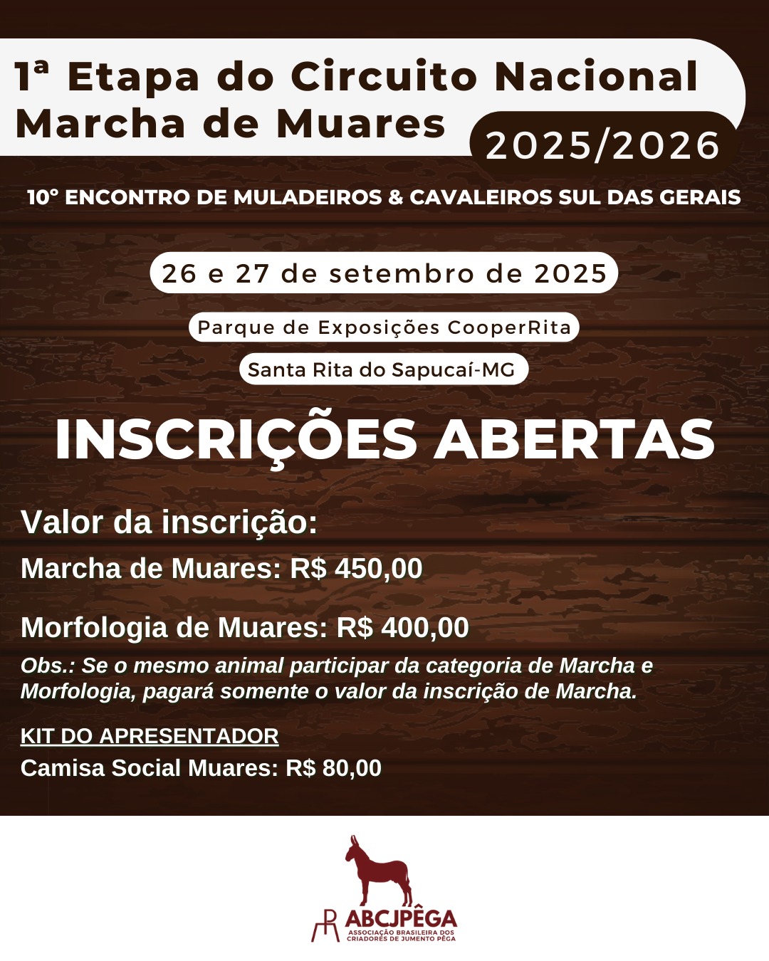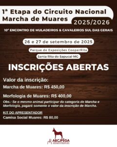 Inscrições abertas para a 1ª Etapa do Circuito Nacional de Marcha de Muares 2025/2026, que acontecerá durante o 10º Encontro de Muladeiros & Cavaleiros Sul das Gerais